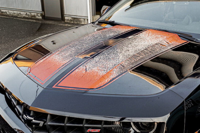 既存の純正ストライプを剥がし、下地にグレアコーティングをおこないました。