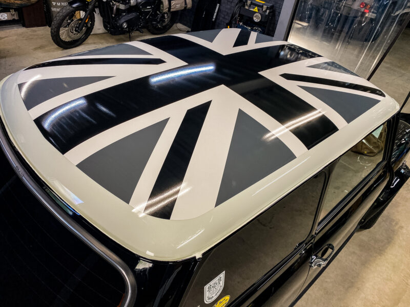 単なる「移動手段」を超えて、もはや一つの文化遺産とも言えるクラシックMINI。 その愛くるしいシルエットに、あえて彩度を抑えた「フードストライプ」と「モノトーン・ユニオンジャック」のラッピングを施す。それは、MINIが歩んできた輝かしい歴史へのリスペクトであり、オーナー様の現代的な美意識の表現でもあります。