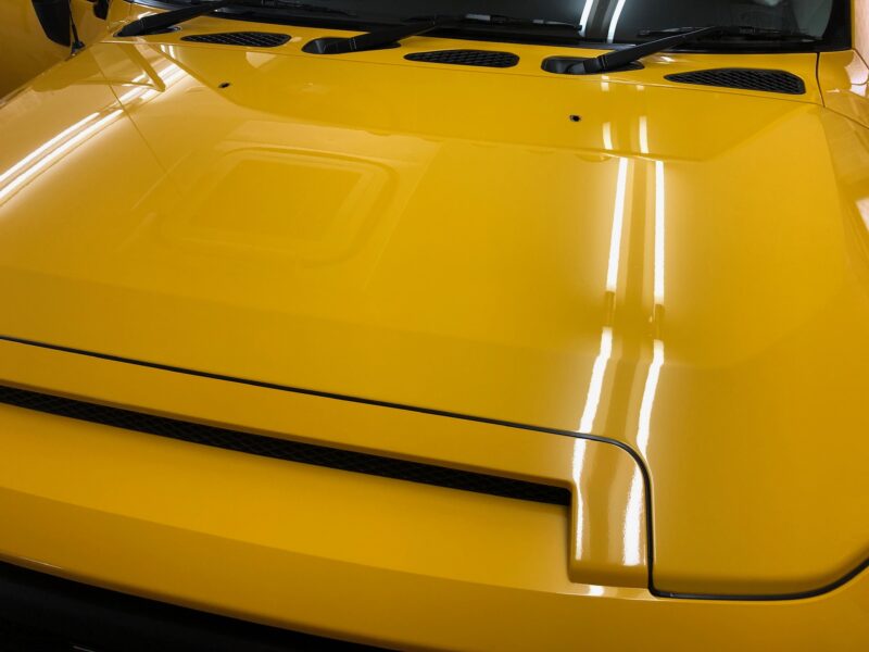 fjクルーザーのボンネットフィルムの施工後完全に乾いた時にエア残りがないか確認するところ