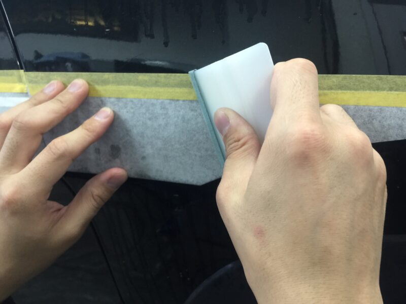 透明や和紙のアプリケーションフィルムの上からスキージなどで再度ならします。